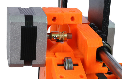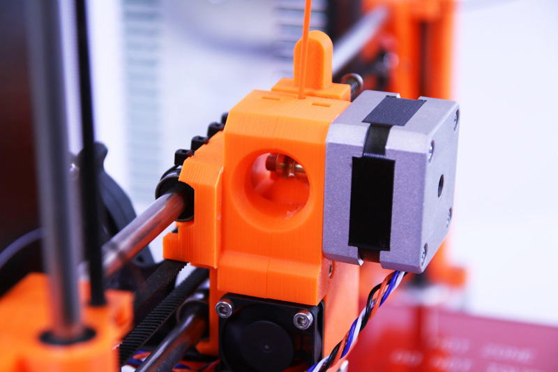 Při výměně filamentu se může stát, že zbytek původního filamentu zůstane uvnitř teflonové hadičky uvnitř extruderu. V takovém případě je třeba kompletně povolit dva šroubky s pružinami držící idler a odklopit ho. Na obrázku pod podávacím kolečkem vidíte zbytek černého filamentu, který je potřeba opatrně odstranit pomocí pinzety nebo kleštiček.